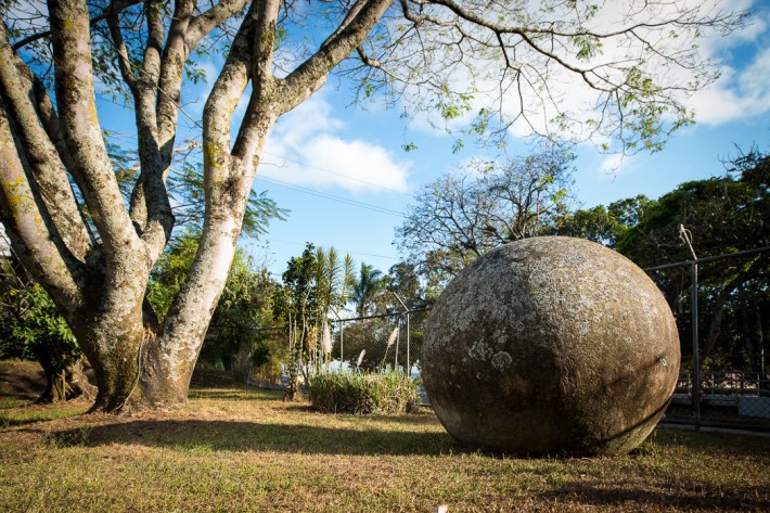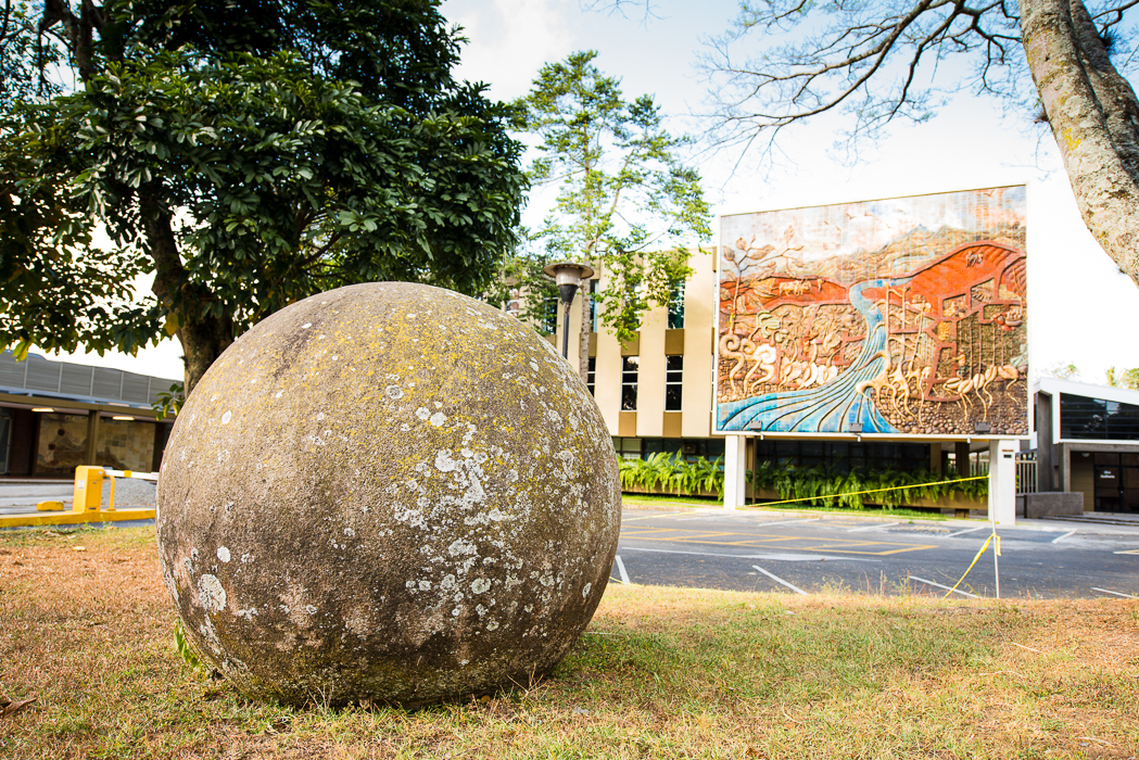 Seguro que aquí muchos la pueden reconocer. Sí, está en la Facultad de Ciencias Agroalimentarias de la Universidad de Costa Rica, en la sede de San Pedro de Montes de Oca. Ha estado ahí por mucho tiempo, posiblemente desde los años setenta del siglo pasado y fue traída, como muchas otras esferas precolombinas, del Sur del país; quizá de Osa o de otro cantón del Pacífico Sur, que son los lugares donde están los sitios arqueológicos con esferas de piedra.