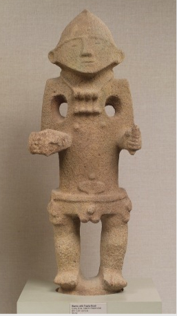 Si alguien me preguntara sobre el período de tiempo en que se podría ubicar la escultura que está en el MET diría que es Aguas Buenas, quizá de la parte final del mismo (300 d.C.- 800 d.C.). En este período son comunes las representaciones de cabezas trofeo y de hombres con emblemas de poder y de violencia. En el período siguiente, pareciera que en lugar de cabezas trofeo y armas, lo que se tiende a representar son prisioneros: hombres vivos que todavía conservan sus cabezas.